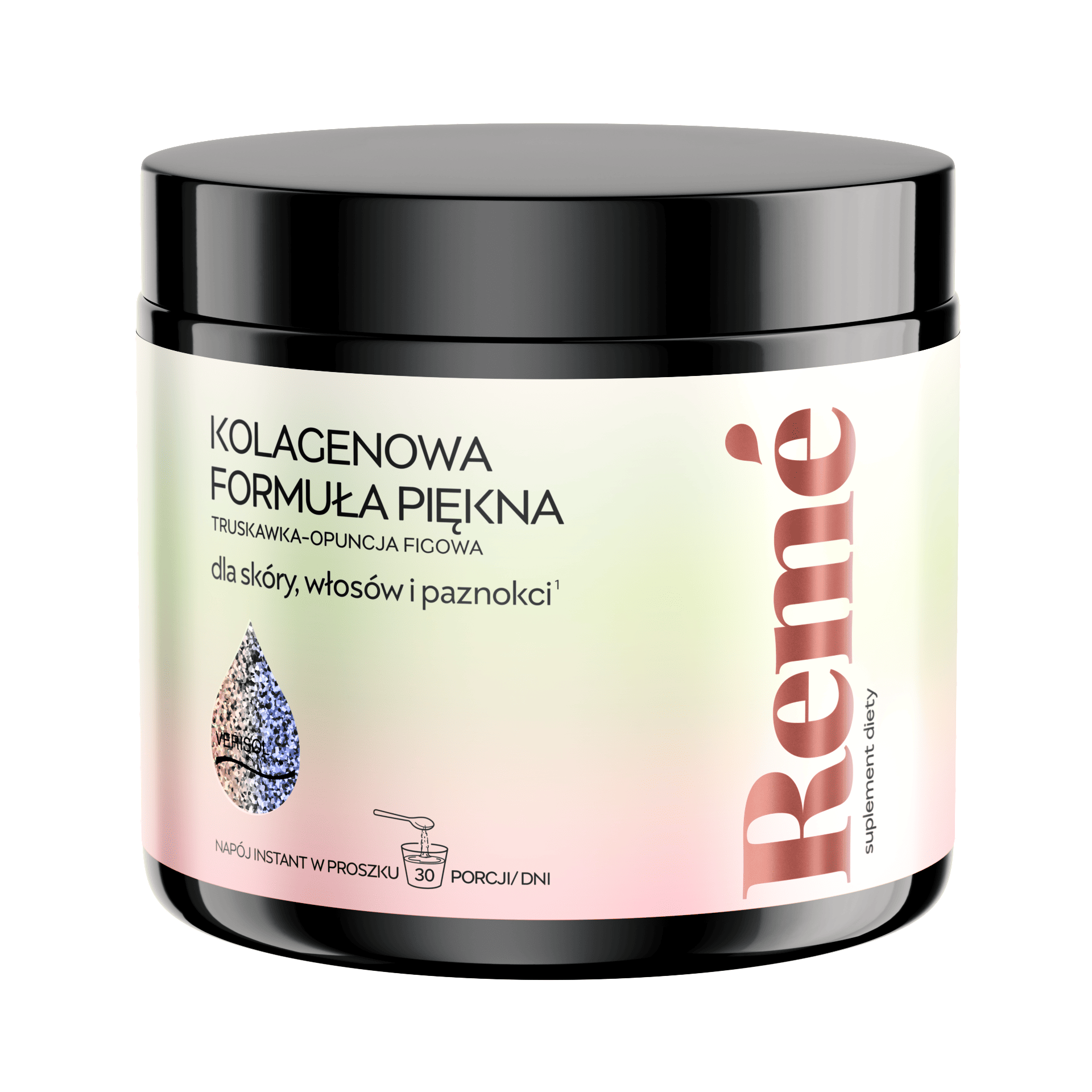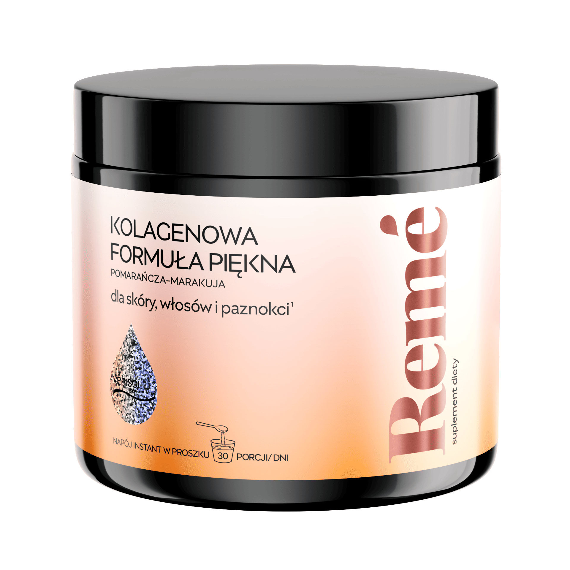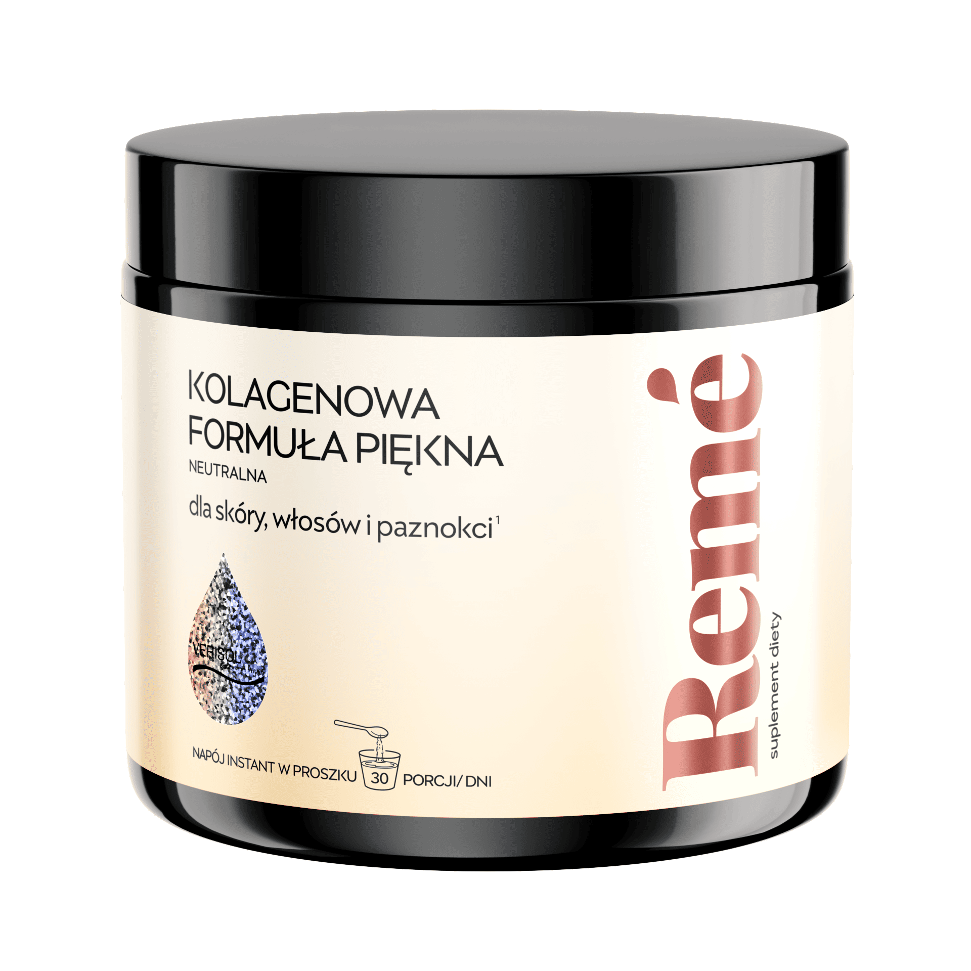 Zatrzymaj młodość. Podaruj swojej skórze, włosom i paznokciom to, czego potrzebują, by zachować młodość na dłużej. Wraz z wiekiem poziom kolagenu w organizmie zmniejsza się i zaczynają występować pierwsze oznaki starzenia. Kolagen do picia VERISOL® może pomóc stymulować metabolizm skóry i przeciwdziałać utracie kolagenowej macierzy pozakomórkowej od wewnątrz. Suplement diety Remé to kompleksowa kolagenowa formuła piękna oparta o składniki najwyższej jakości, które pomogą zapewnić Twojej skórze, włosom i paznokciom to, co najlepsze - od wewnątrz.