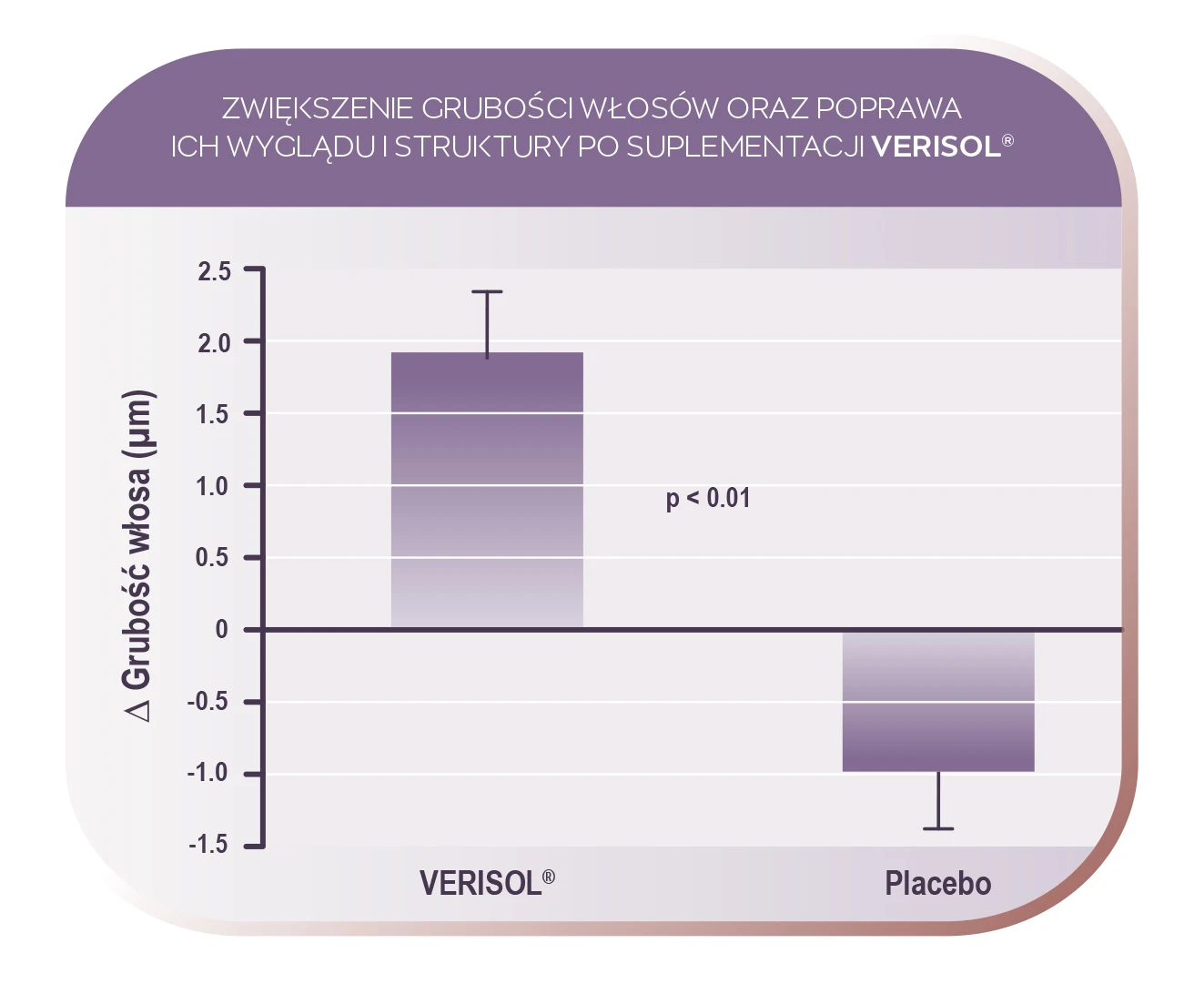 Suplementacja trwała 16 tygodni (4 miesiące). Po tym czasie zaobserwowano u kobiet z grupy, w której podawano kolagen VERISOL® znaczący wzrost grubości włosów, czyli kluczowy aspekt poprawy struktury i wyglądu włosów.