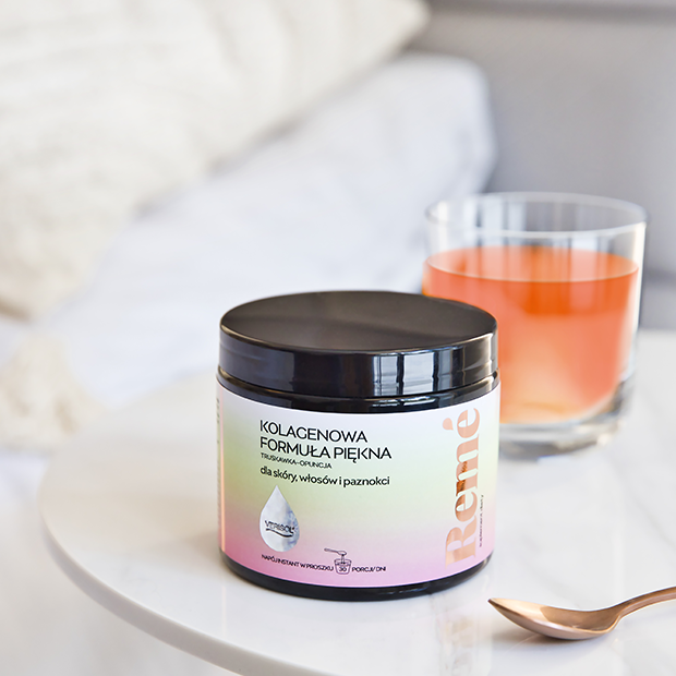Po ukończeniu 20 roku życia, ilość kolagenu typu I w skórze ulega zmniejszeniu – o około 1% rocznie. Kolagen można suplementować, ale ważna jest jego forma, która determinuje jego biodostępność (w uproszczeniu wchłanialność). Remé to kompleksowa kolagenowa formuła piękna na skórę, włosy i paznokcie. Zawiera w swoim składzie opatentowane peptydy kolagenowe VERISOL®, których skuteczność działania została potwierdzona badaniami klinicznymi. Dodatkowo witamina A, tak zwany Retinol A, czy tez witaminy z grupy B, B2, B3, B7, a także jod pomagają zachować zdrową skórę. Remé występuje w 3 smakach, w postaci proszku, który rozpuszcza się w wodzie lub w soku, smoothie, a nawet w kawie czy owsiance – oczywiście niezbyt gorących, przestudzonych.